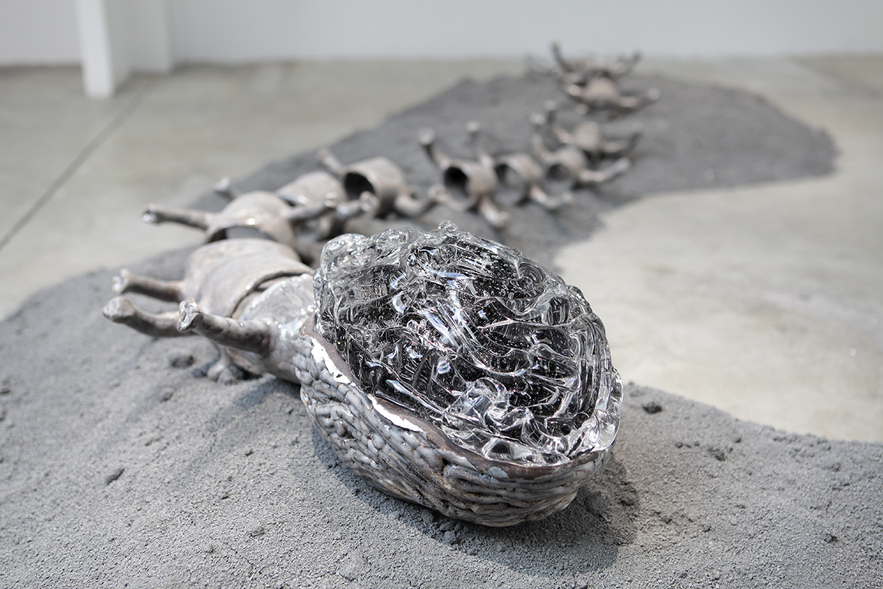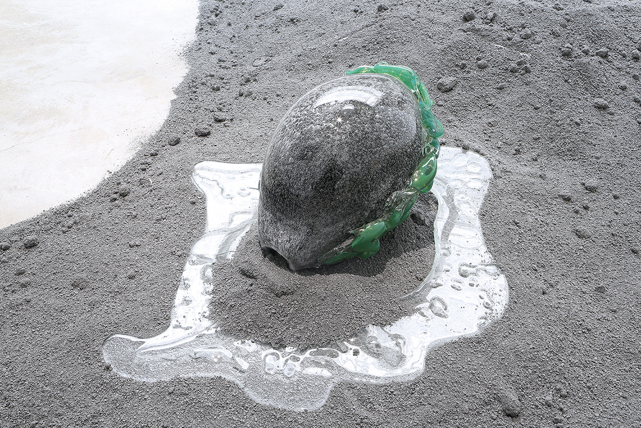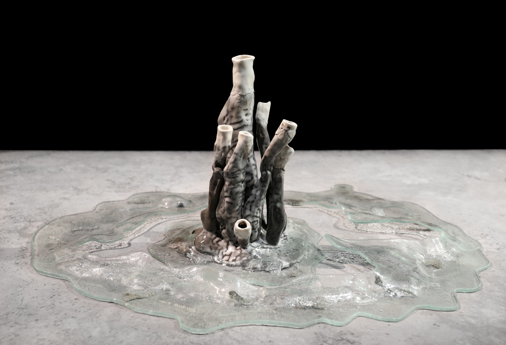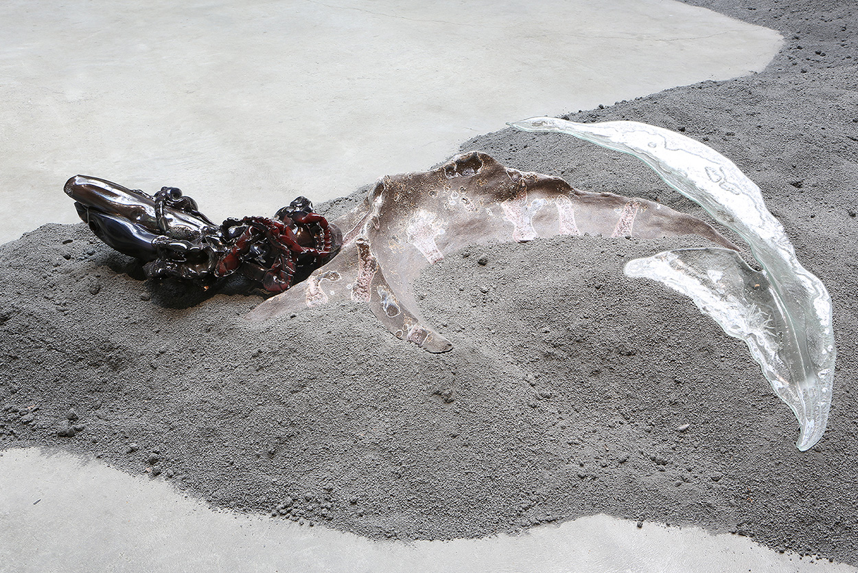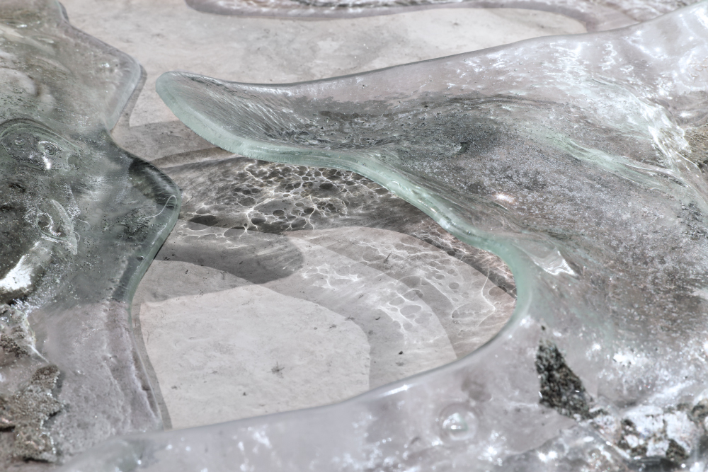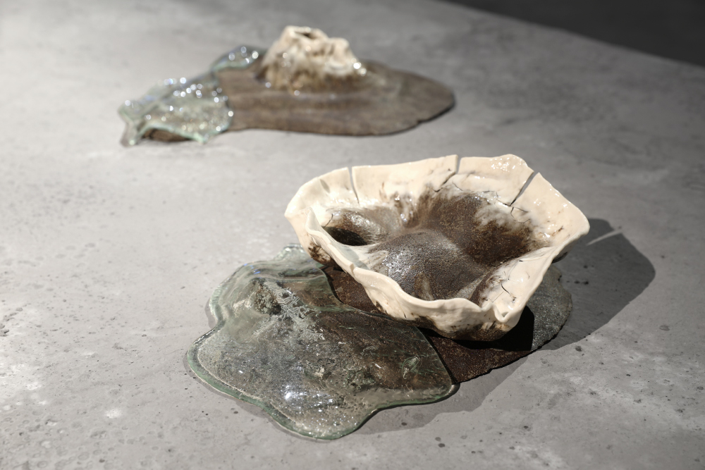 Grès et porcelaine émaillés, verre soufflé et thermoformé, sable volcanique, 10 x 7 x 1 m.