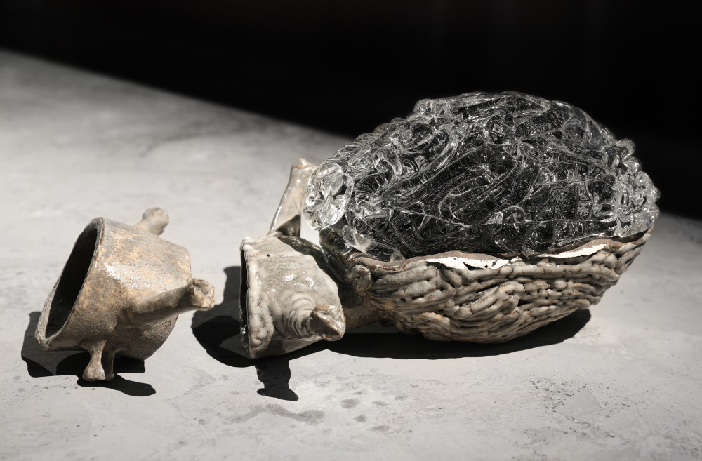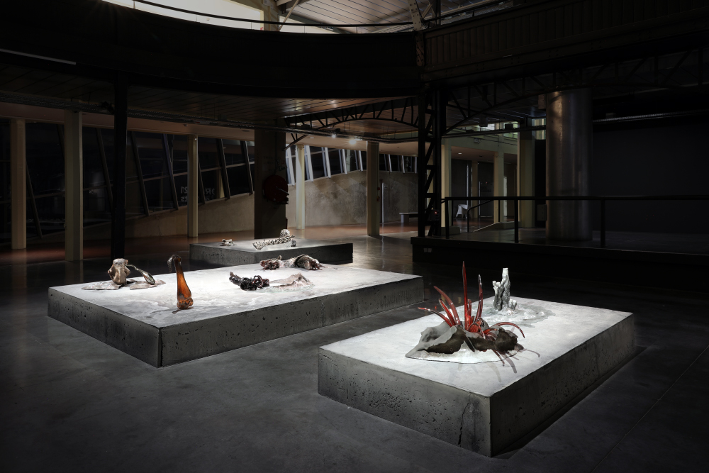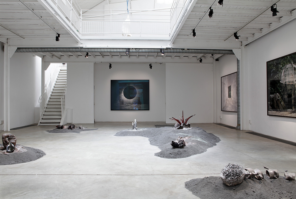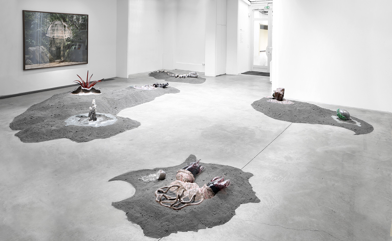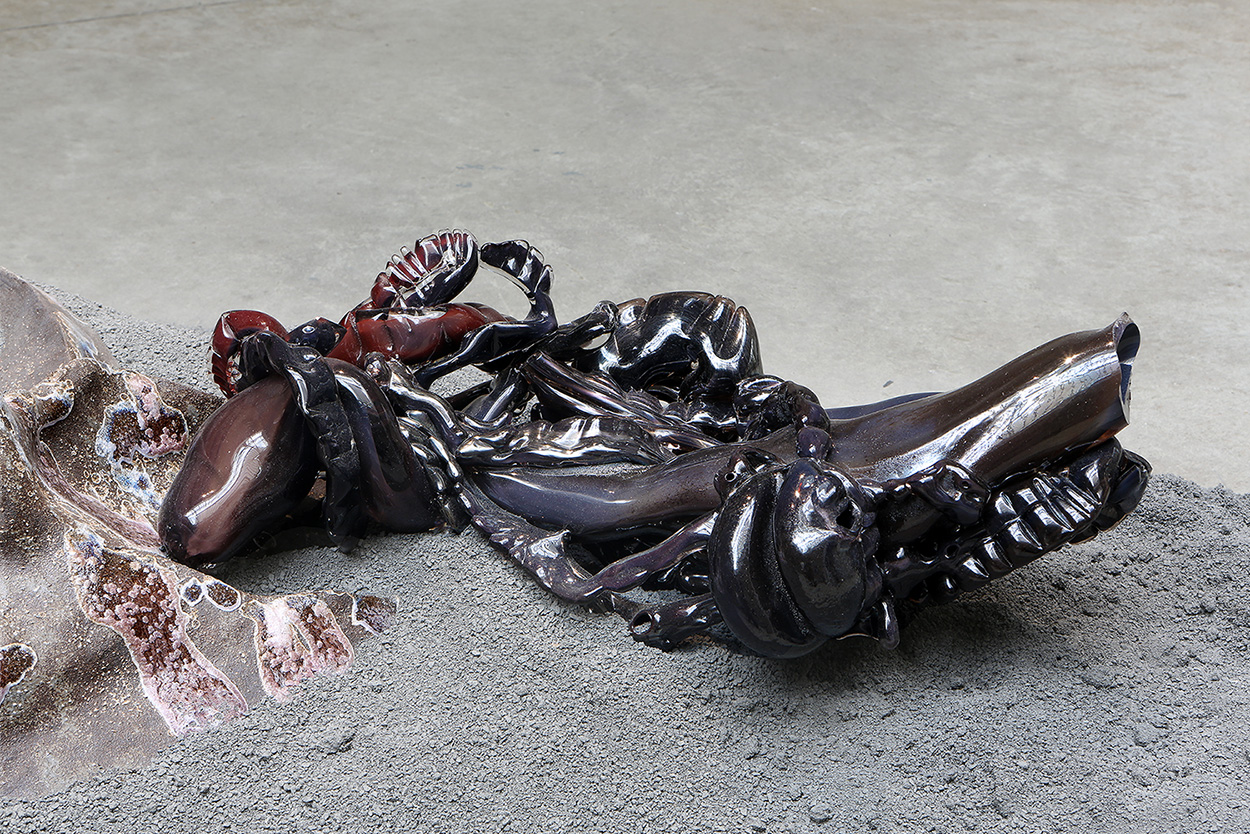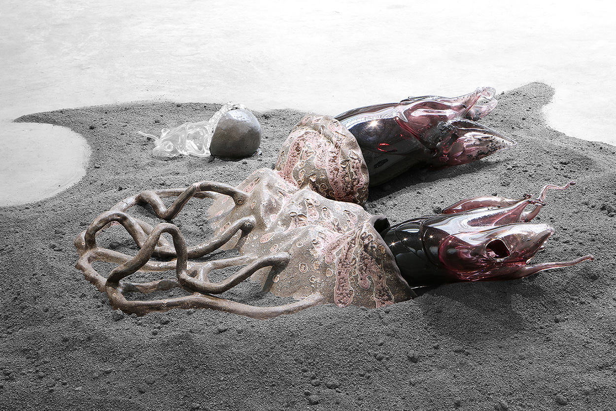 Grès et porcelaine émaillés, verre soufflé et thermoformé, sable volcanique, 10 x 7 x 1 m.