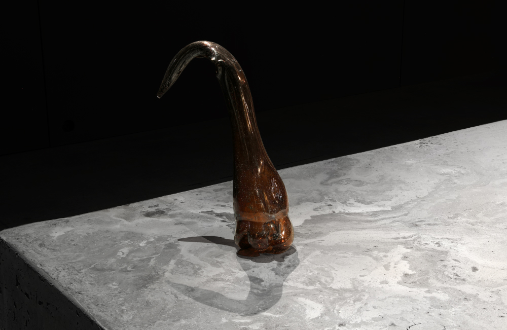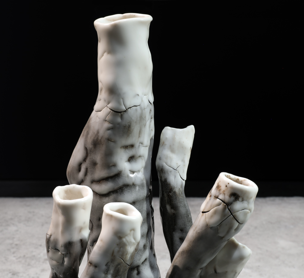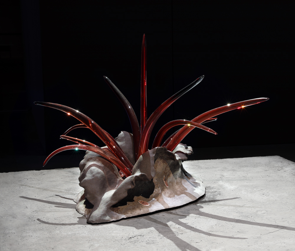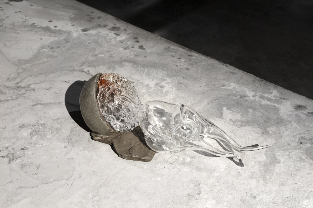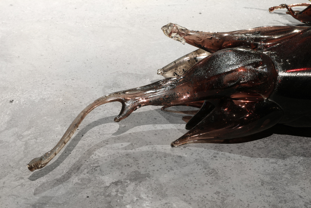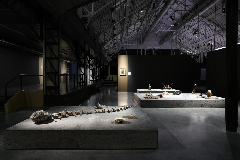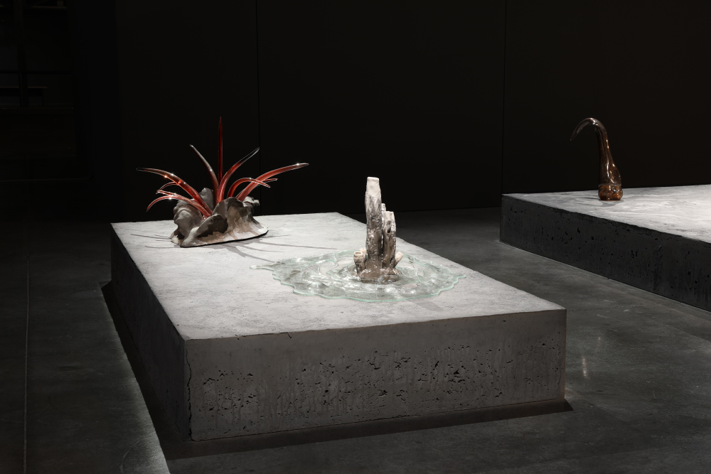 Grès et porcelaine émaillés, verre soufflé et thermoformé, sable volcanique, 10 x 7 x 1 m.