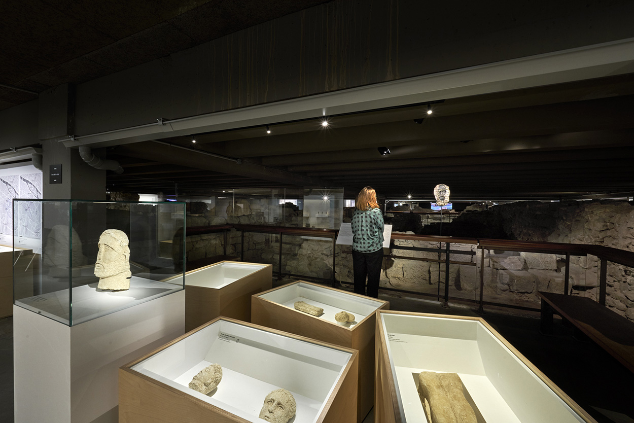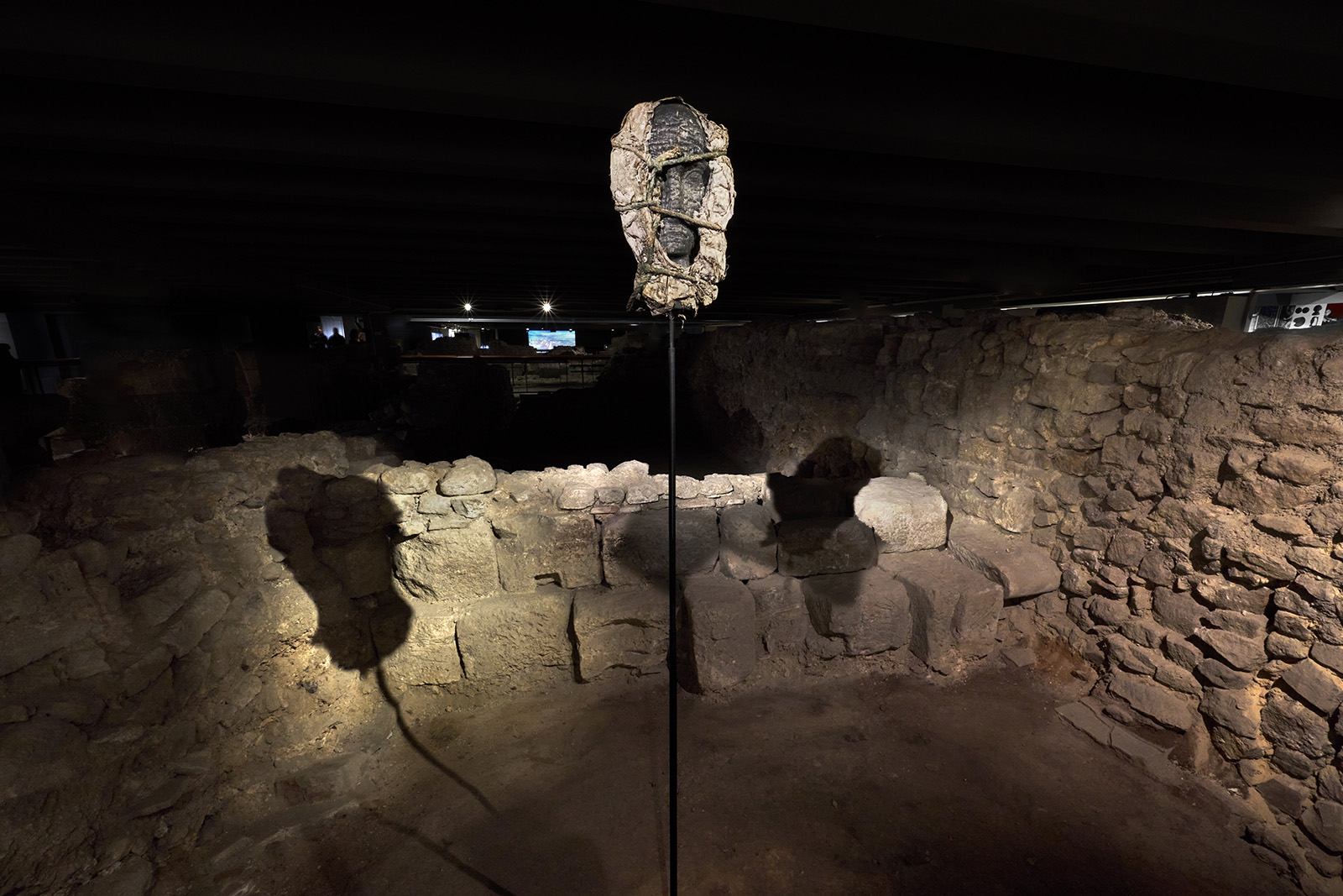 Après plusieurs semaines d'immersion, une des sculptures "martyres" ayant absorbé les polluants du fleuve est exposée au côté des ex-voto antiques des sources de la Seine.