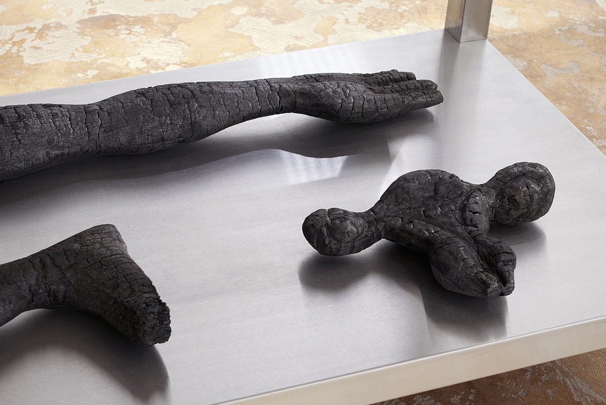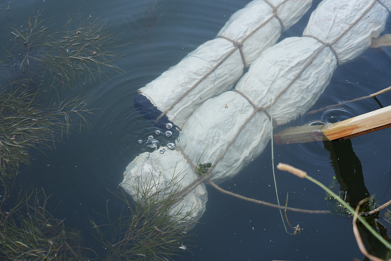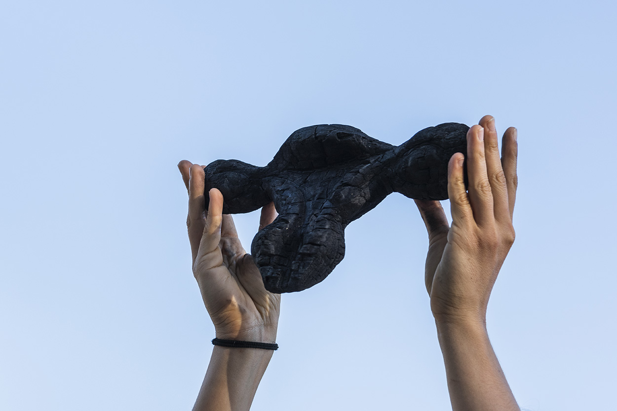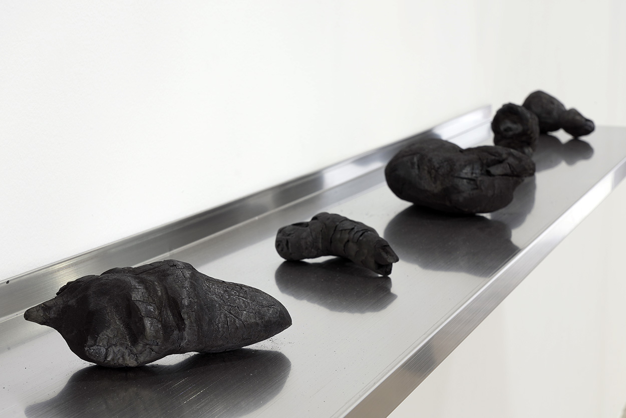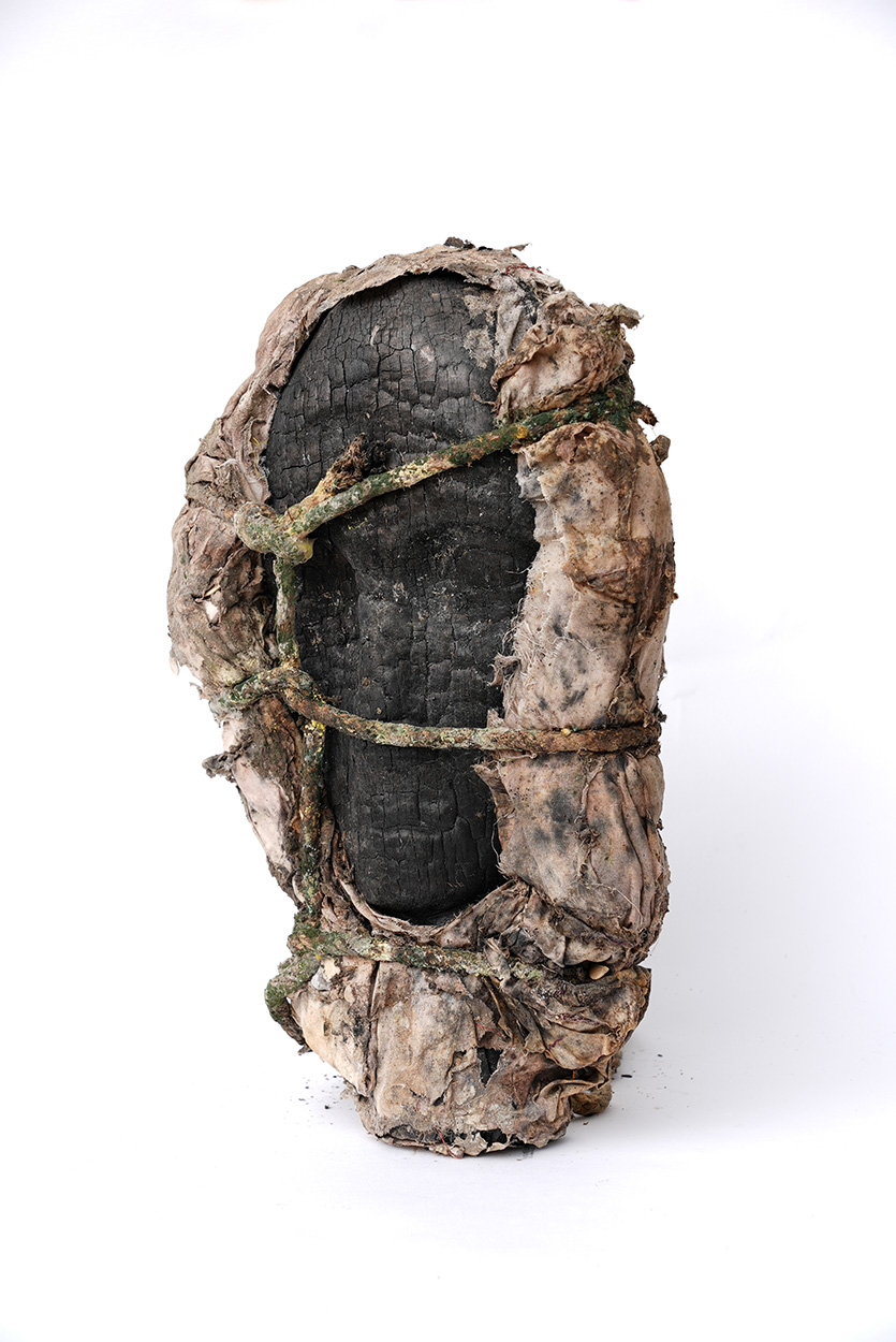 Réactivant d’anciens gestes d’offrande, de sacrifice et de dialogue avec la Seine, des sculptures inspirées des ex-voto en bois trouvés aux sources du fleuve ont été sculptées, carbonisées et présentées lors d’une exposition à la Galerie municipale Jean Collet à Vitry-sur-Seine. A l’issue de celle-ci, les sculptures représentant des organes internes ont été transformées en charbon actif, une matière ultra-absorbante utilisée pour la purification de l’eau. L’activation du charbon a conduit à la destruction des sculptures et les fragments de charbon actif ainsi obtenus ont été cousus dans des linceuls en coton.