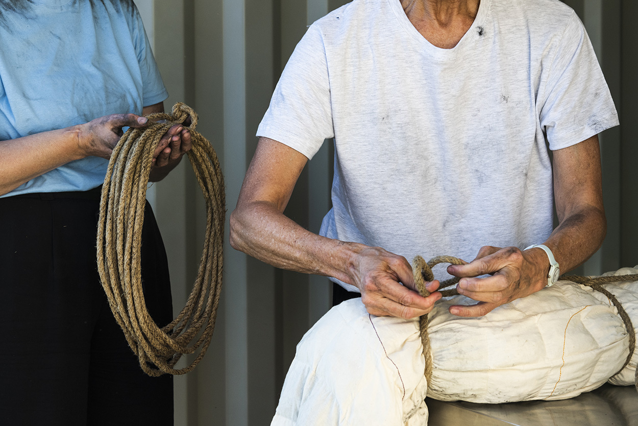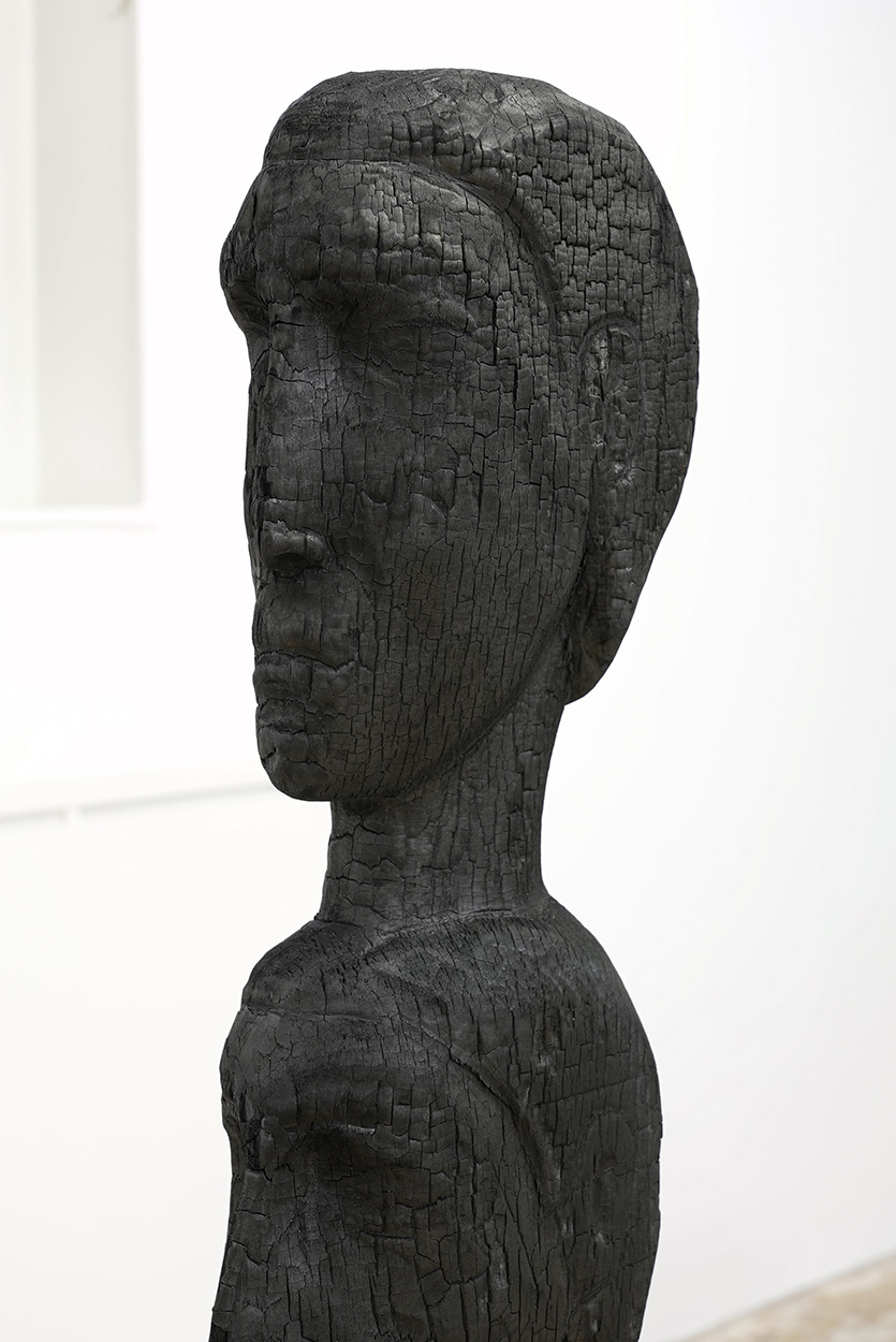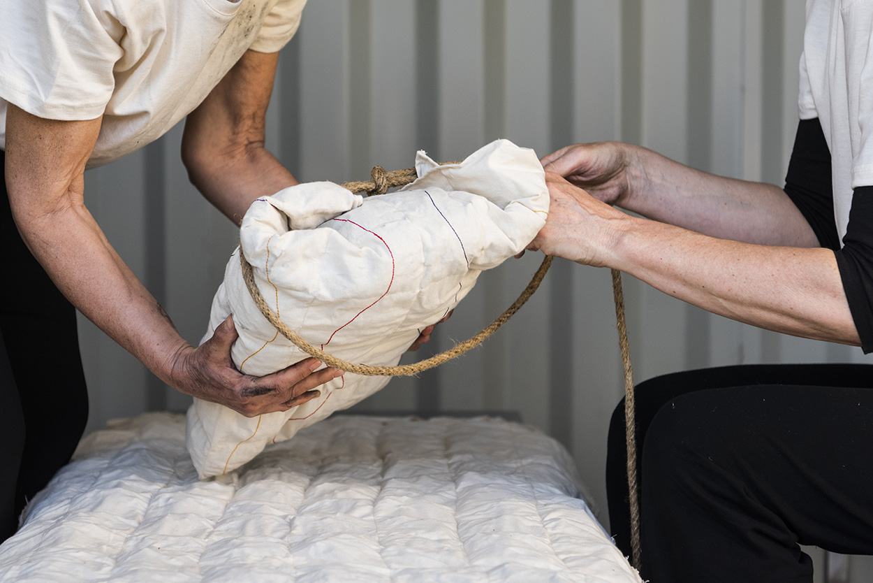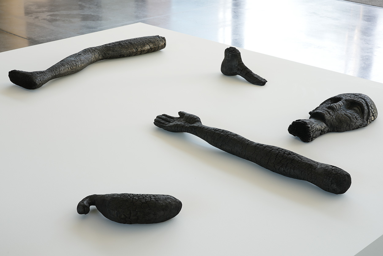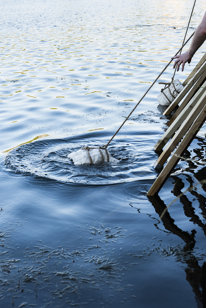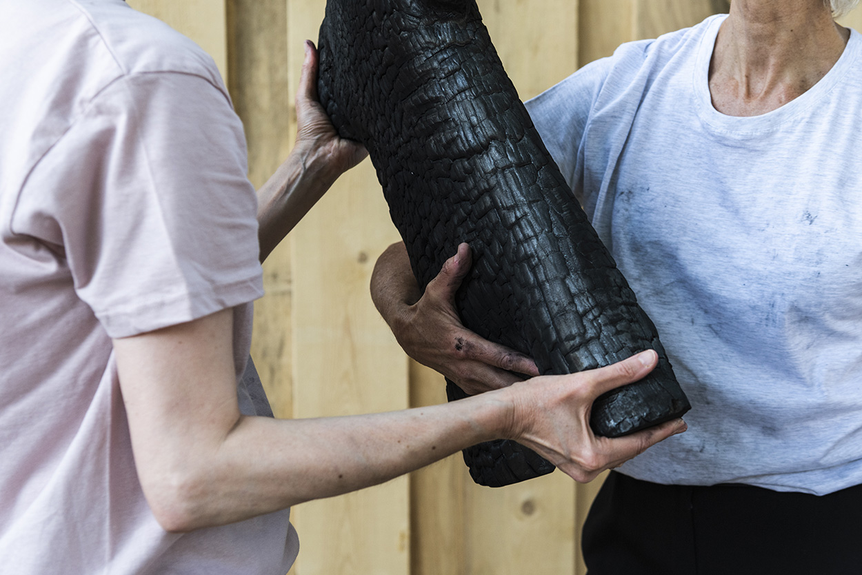 Réactivant d’anciens gestes d’offrande, de sacrifice et de dialogue avec la Seine, des sculptures inspirées des ex-voto en bois trouvés aux sources du fleuve ont été sculptées, carbonisées et présentées lors d’une exposition à la Galerie municipale Jean Collet à Vitry-sur-Seine. A l’issue de celle-ci, les sculptures représentant des organes internes ont été transformées en charbon actif, une matière ultra-absorbante utilisée pour la purification de l’eau. L’activation du charbon a conduit à la destruction des sculptures et les fragments de charbon actif ainsi obtenus ont été cousus dans des linceuls en coton.