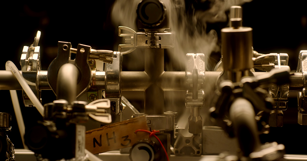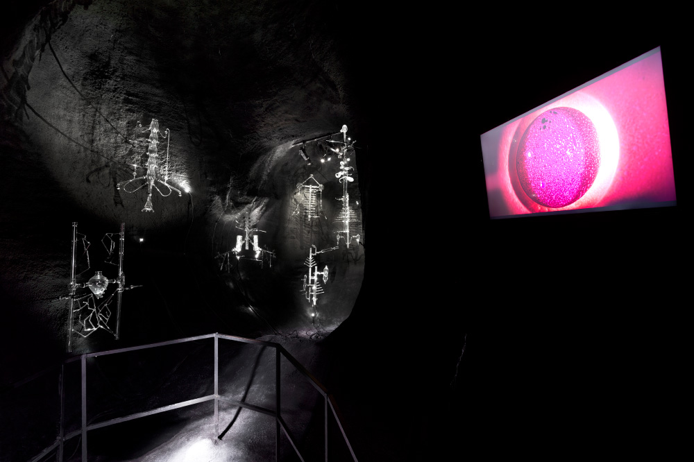 Une vidéo, également visible à l’intérieur de la comète, montre les recherches de l’astrochimiste Louis le Sergeant d’Hendecourt qui tente de recréer en laboratoire les conditions hypothétiques d’apparition de la vie sur terre. Synthétisant des matériaux cométaires qu’il soumet à diverses opérations de transformation, il tente de passer de l’inerte à l’inanimé et ainsi de créer des formes de vie élémentaires. Ces vues de laboratoire sont entremêlées avec une imagerie alchimique liée aux différentes phases du Grand Œuvre.